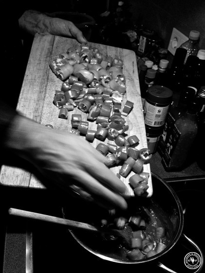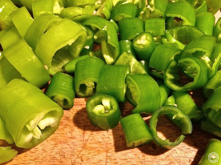 Für das Paprikagemüse haben wir unterschiedliche Größen und Schärfen von grünem Spitzpaprika. Mit 3EL scharfer Paprikapaste (Biber Salçasi),