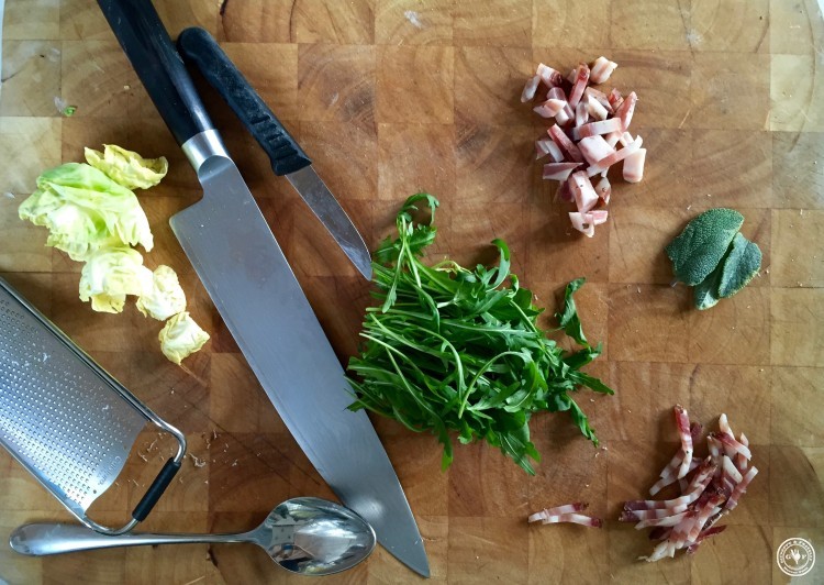 … und in feine Streifen geschnittenem Speck bei mittlerer Hitze zerlassen, und wenn die Ravioli für euch passen, raus mit den Jungs und in die Pfanne geben und zusammen mit den restlichen Blumenkohlrosen und einer Hand voll Rucula alles nochmals schwenken und sofort servieren.