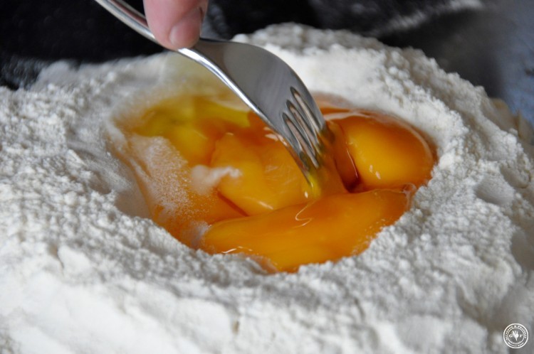 in die Mitte eine Mulde machen und 3 Eier einschlagen, mit 1 EL Olivenöl und einer Brise Salz alles gut vermischen. Mit einer Gabel die Eier anstechen und vom Rand her das Mehl in die Eier einarbeiten.