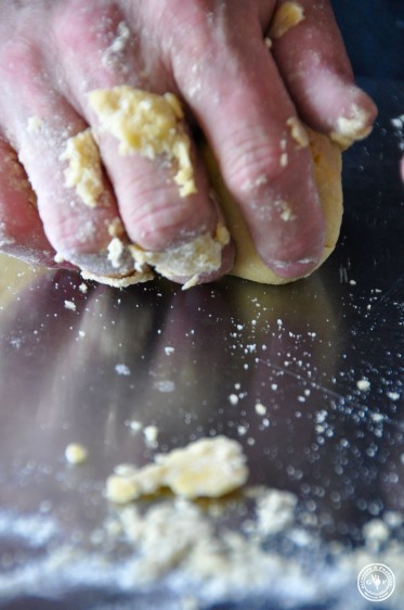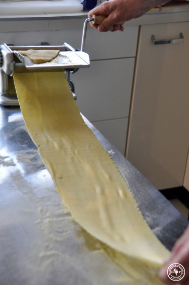 Jetzt den Teig mit einer Nudelmaschine durch die Nudelmaschine geben. Dabei die Stärke an der Nudelmaschine immer kleiner stellen bis man bei der dünnsten Rüstung angelangt ist. Die Oberfläche des Tischs mit Weizengriess bemehlen, dann klebt nichts an.