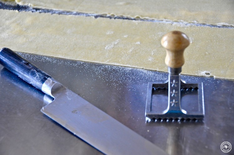 Mit dem Spritzsack kleine Häufchen spritzen und eine zweite Bahn darüber legen. Jetzt könnt Ihr die Ravioli mit einer Ravioliform ausstechen und mit Weizengries bestäubt zur Seite legen.
