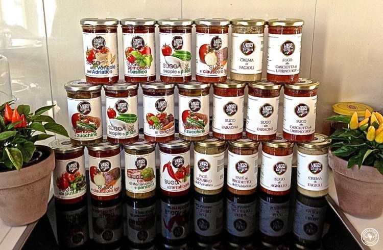 Sie enthalten keine Zusatzstoffe und schmecken genau so wie Saucen einfach schmecken sollen: Nach natürlichen Zutaten allererster Güte, sonnigen, vollreifen Tomaten (diese wählen sie teilweise von Hand nach dem Reifegrad aus), duftendem Basilikum oder Gemüse aus dem Gemüsegarten, nach Fleisch (und nicht nach Fett), frischestem Fisch (den sie morgens um 4 auf dem Fischmarkt in Civitanova selbst besorgen), bestem nativen Olivenöl (hier kommt nichts anderes ins Glas) und feinsten sonstigen kulinarischen Ingredienzien. Chemie, Farbstoffe oder Konservierungsmittel haben in Veri d’Italias Produkten nichts zu suchen, die Zutaten kommen vornehmlich aus der Region, alle aber aus Italien. Die Tomaten fließen schwer im Glas, das Olivenöl schimmert mit goldenen Reflexen, die Venusmuscheln kann man im Glas noch als solche erkennen, und es gibt – je nach Sorte – Fisch- Gemüse oder Fleischeinlage satt: Bis zu 40% davon befindet sich in den Sughi! Eine Großzügigkeit, die man andernorts – wo nur noch ein paar Industriefasern für die Optik und künstliche Aromen für den Geschmack verantwortlich sind – vielfach vermisst. Natürlich haben wir die Saucen vorab ausprobiert und sind begeistert: Gesundes Fast Food allererster Güte & ohne schlechtes Gewissen! Die Sughi sind fix und fertig, perfekt abgeschmeckt und zaubern dampfend köstliche Pastagerichte alla Mamma ruck zuck auf den Tisch.
