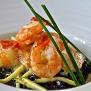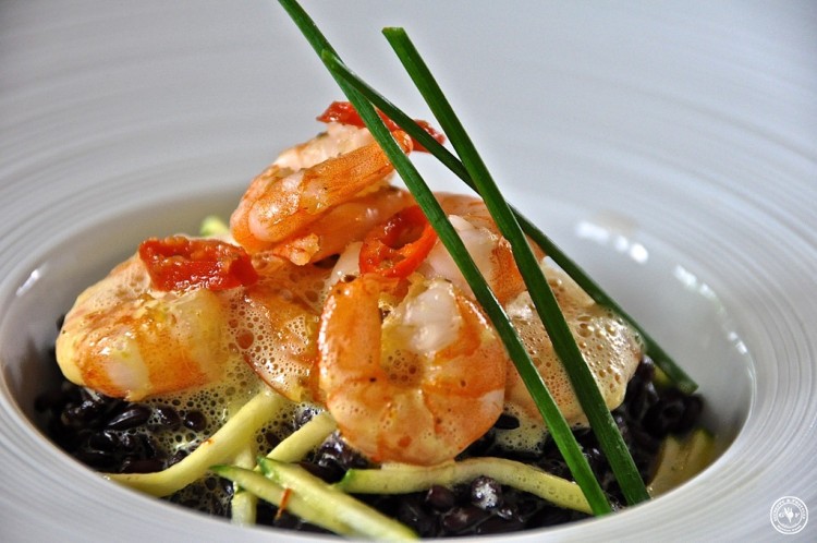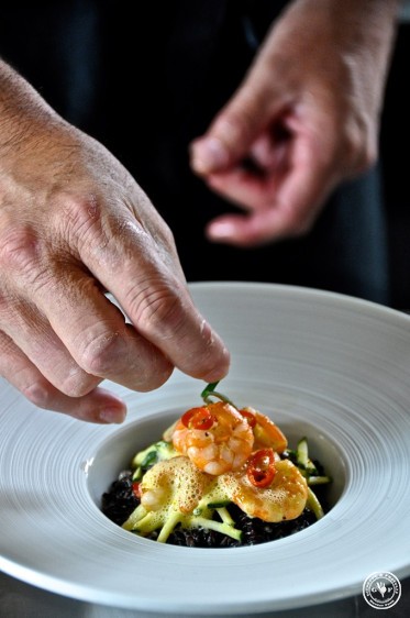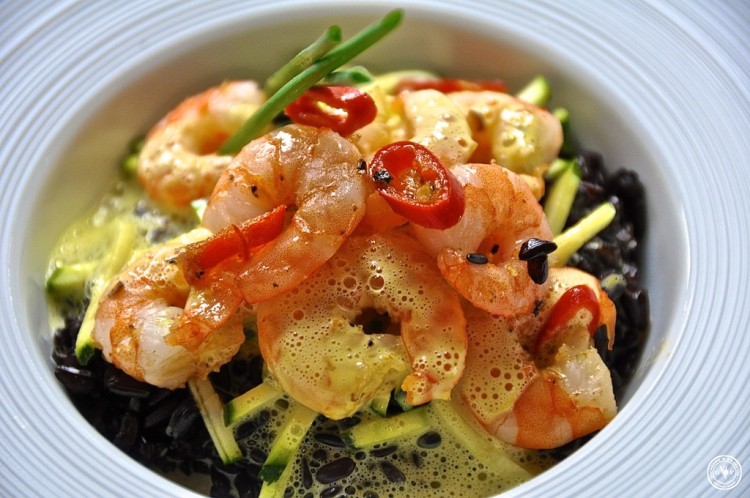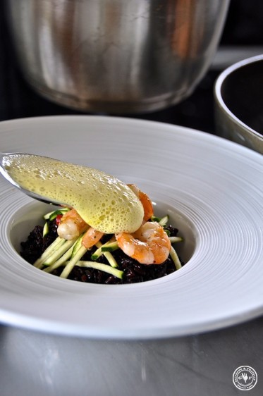 Risotto venere con gamberi & zucchine allo schiuma di zafferano – Risotto von schwarzem Reis mit Shrimps & Zucchini an Safran-Schaum.
