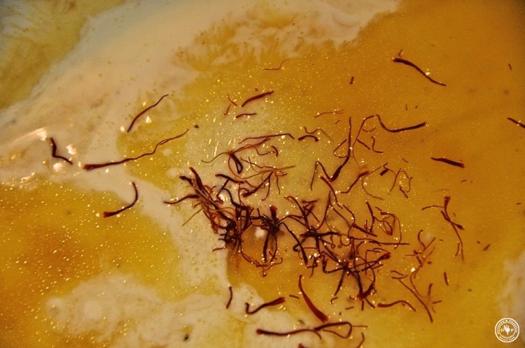 mit Weisswein ablöschen und um 50% einreduzieren lassen. Dann die Sahne und den Safran zugeben.