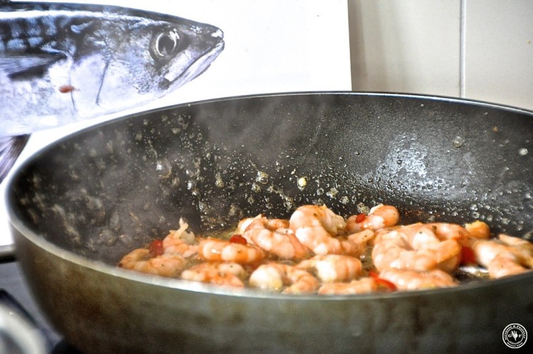 Die Garnelen in Olivenöl und Chili anbraten (bei uns schaut der Kollege zu…)