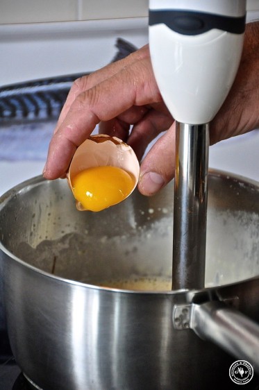 Übrigens läuft immer noch alles mit einer Hand bei mir. Als Finish kleine Cherry Tomaten vierteln und die Sauce mit dem Eigelb, dem Ziegenfrischkäse, Salz und Pfeffer abschmecken und mit dem Zauberstab schaumig aufschlagen.