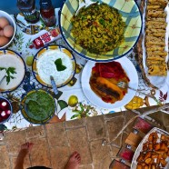 Nach 5 Minuten ist das Cous-Cous fertig. Mit einer Gabel auflockern und in die Schüssel zu den Oliven/Getr. Tomaten, die Aubergine/Zucchini/Paprika geben, dazu kleingeschnittene frische Minze, gezupftes frisches Basilikum, 1 EL Mandel- oder Haselnuss-Stifte, 1 EL in heissem Wasser eingeweichte Rosinen, 2 gehäufte TL Ras-el-Hanout (oder Currypulver), Saft einer Limette und viel Olivenöl Extra Vergine hinzufügen und alles unterheben.