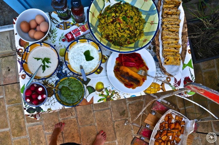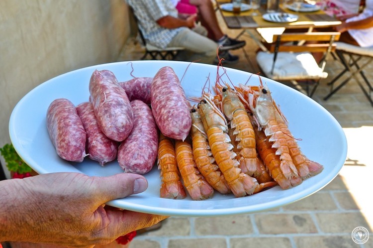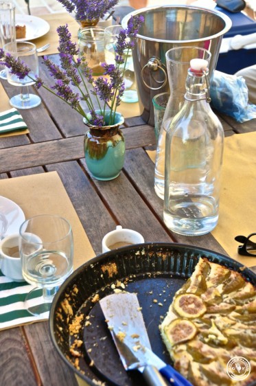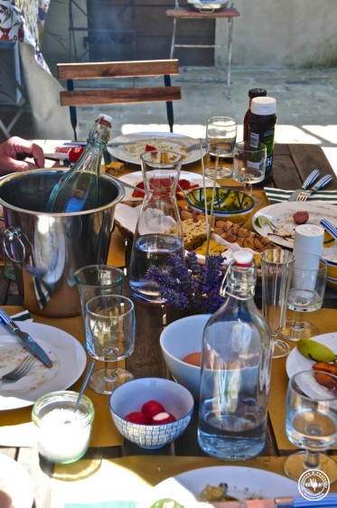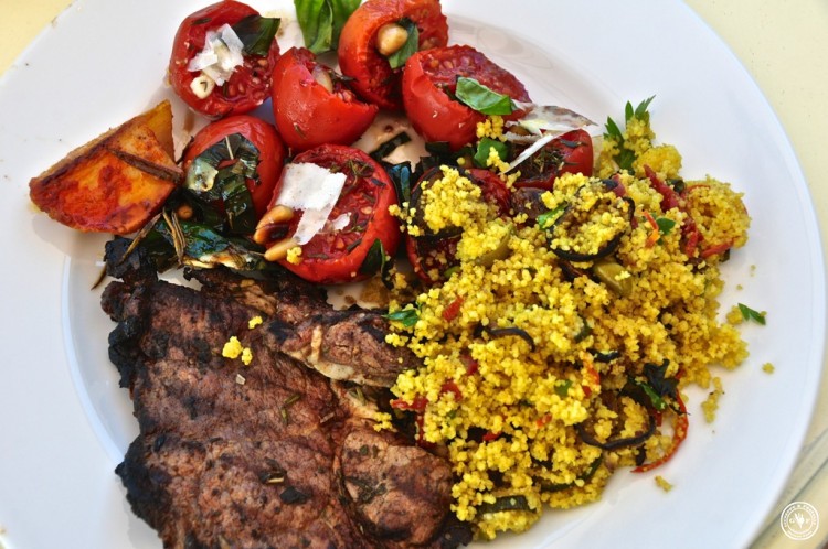 Unsere Aufstellung: Gegrillter marmorierter Schweinehals, mariniertes Lamm, Salsiccia und vorweg Scampi, dazu gebackene Paprika mit Thunfischcreme aus dem Piemont, gegrillte Kräuter-Ziegenkäse-Champignons, Minzpesto, Zaziki, eine selbstgebackene Tomaten-Oliven Focaccia, gebackene Kartoffelspalten aus dem Ofen, ein orientalischer Cous-Cous-Salat, Radieschen, Bier, Wasser & Wein 🙂