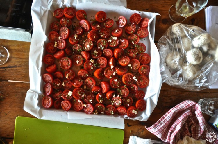 Tomatensalat aus dem Ofen (aus der Sommerausgabe der Zeitschrift Essen & Trinken – ein tolles Rezept!): Ein Backblech mit Tomatenhälften füllen (aromatische Sorte nehmen), Schnittflächen nach oben und großzügig mit Olivenöl beträufeln. Anschließend mit kleingehacktem Knoblauch und Thymian nach Gusto bestreuen.