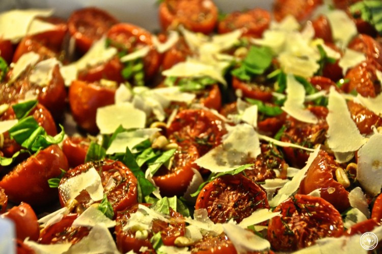 Im mittleren Backblech auf 80° ca. 1,5h backen. In der Zwischenzeit Pinienkerne fettfrei in einer Pfanne rösten und zur Seite stellen. Parmesan grob hobeln und Basilikum zerzupfen. Die Tomaten aus dem Ofen nehmen und den ausgetretenen Sud abgießen. In einer Schüssel mit etwas Olivenöl, Balsamico-Essig, Salz Pfeffer und einer Prise Zucker verrühren und über die Tomaten gießen. Tomatensalat anschließend mit den Pinienkernen, etwas grobem Meersalz und dem Basilikum bestreuen. Nach Belieben etwas frischen Pfeffer darüber mahlen.