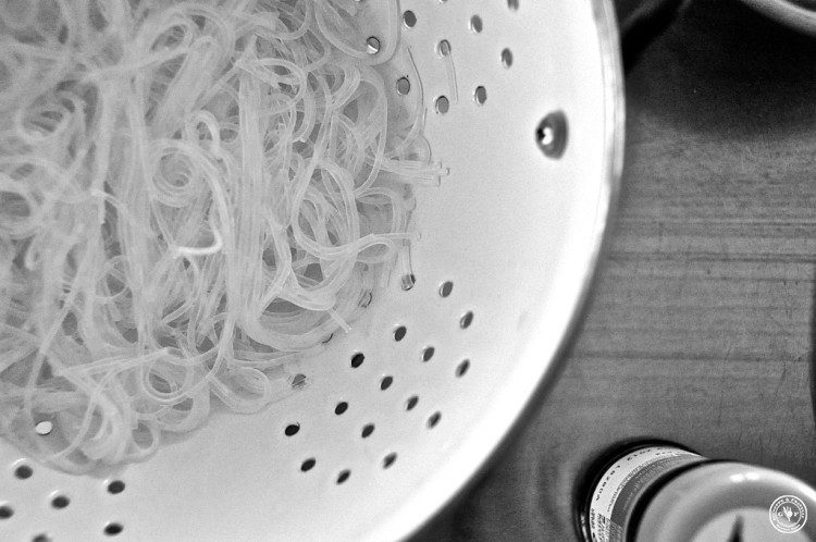 100g Reisnudeln nach Packungsangabe kochen, abgießen und mit kaltem Wasser übergießen, damit sich nicht weitergaren,
