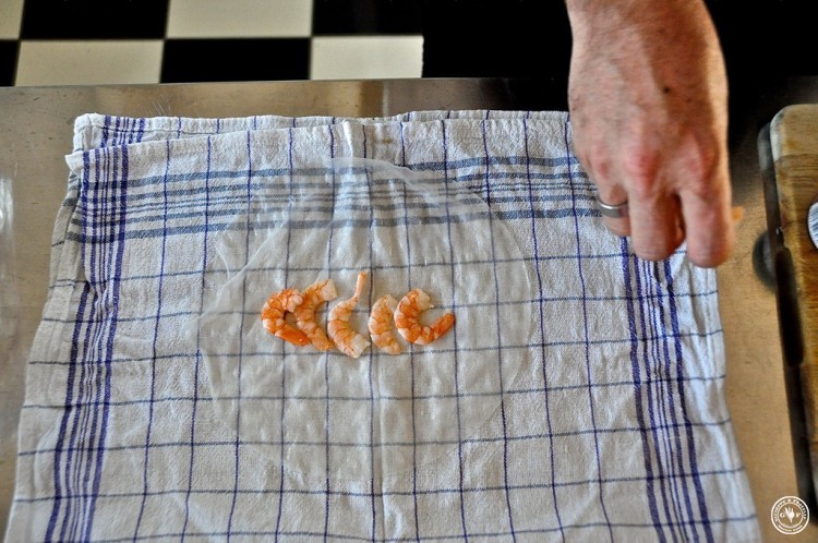 Die Zutaten aufeinander schichten. Mit den Garnelen fangen wir an…