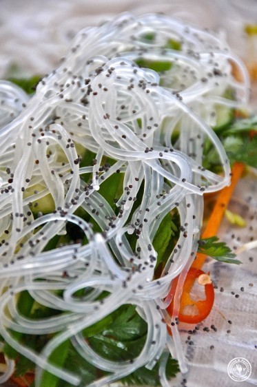 Zuletzt die Glasnudeln, Mohn und Sesamöl zum Finish.