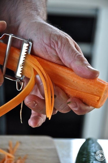 Die ganzen Zutaten werden vorbereitet: Chili hacken, Gurke in Scheiben schneiden, die Möhre schälen und in Julienne schneiden (ganz dünne Streifen).