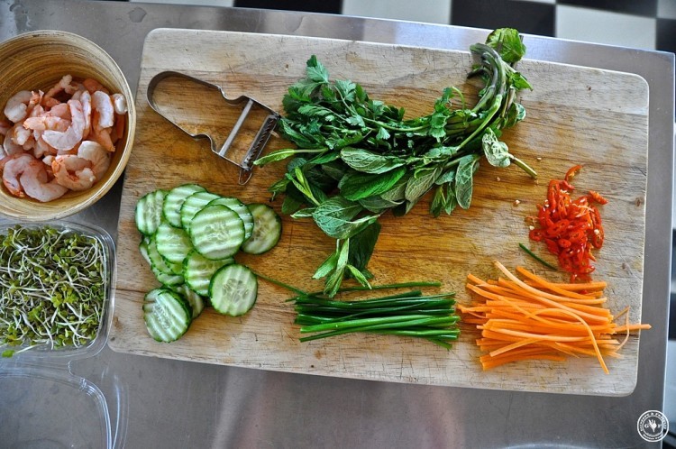 Die Sprossen (ich hatte heute Radieschen-Sprossen) und Kräuter waschen, die Erdnüsse hacken, die Garnelen halbieren, und Mohn und Sesamöl bereithalten.