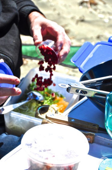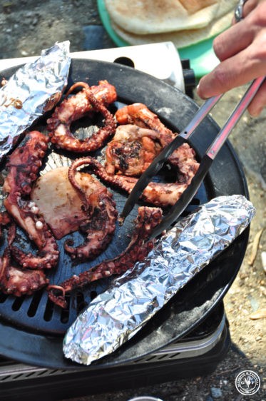 Es gibt Giuseppes sagenhaften Orangen- Fenchelsalat mit Granatapfelkernen und Senfdressing, Rosmarin-Garnelenspieße mit grobem Meersalz, gegrillten Octopus, selbstgemachten, herrlich cremigen Hummus, geröstetes Pita-Brot, Radieschenschnitze sowie etwas Gemüse, das wir noch vom Vortag übrighaben. Die Rezepte und Zutatenliste findet ihr am ganz am Schluss!