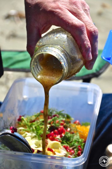 - Dressing: Olivenöl, Weissweinessig, Pfeffer, Lavendelsalz (ersatzweise normales Salz), einen gehäuften TL groben Senf und einen Schluck Ahornsirup miteinander vermengen und über den Salat gießen