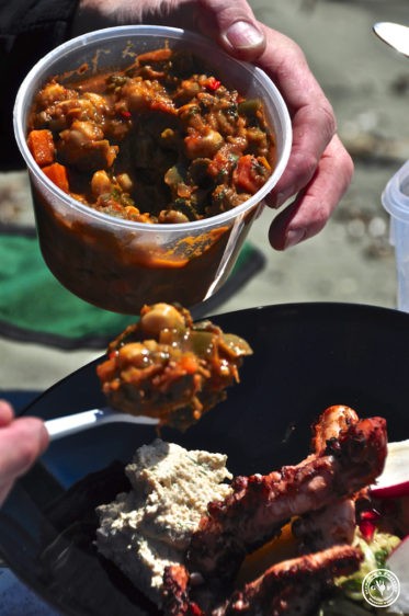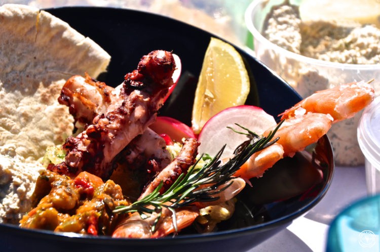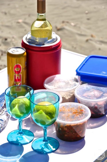 Und jetzt wird gegessen – und wie! Wir futtern zufrieden, genießen das Wellenrauschen, die Musik und unser gutes Schlückchen Wein und lassen uns die Sonne auf den Pelz scheinen… Besser geht es nicht!