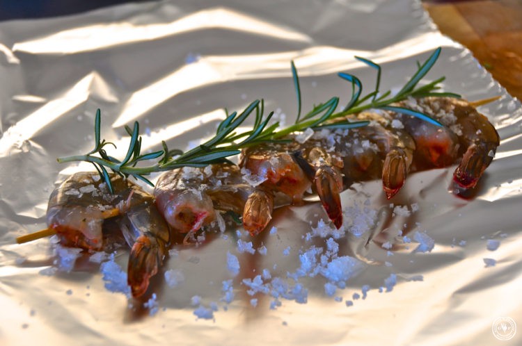 - Alufolie ausbreiten, ein Bett aus grobem Salz anrichten, Spieße und einen Rosmarinzweig dazu und nochmals mit Salz bestreuen. Alupaket verschließen und ab auf den Grill damit (nicht so lange grillen, bis es etwas zischt, dann sind sie fertig)