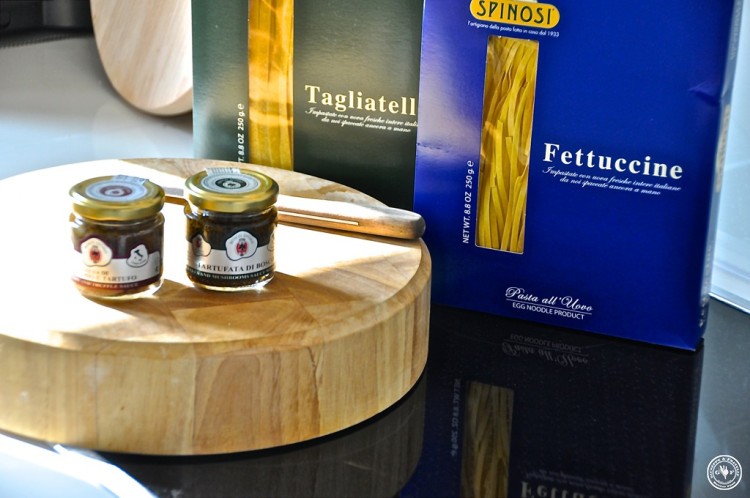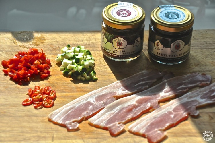 Da es heute schnell gehen muss, nehmen wir die Spinosi-Nudeln. Die sind spitzenklasse und zudem in 2 Minuten fertig. Genau richtig für uns müde Krieger. Fettuccini mit Radicchio Trüfffelsauce und Speck: