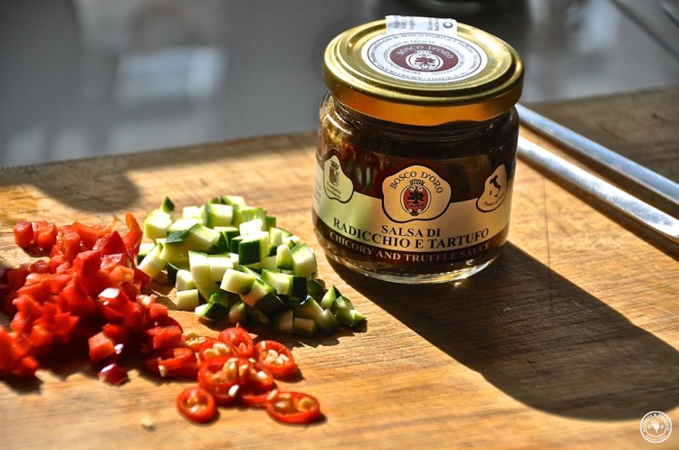 Sobald das Salzwasser für die Pasta kocht, die Spinosi-Fettuccini für 2 Minuten al dente kochen. Ein Glas Radicchio-Trüffel-Salsa von Bosco d´Oro in die Pfanne geben, die fertige Pasta und eine Kelle des Kochwasser hinzu und alles miteinander vermischen.