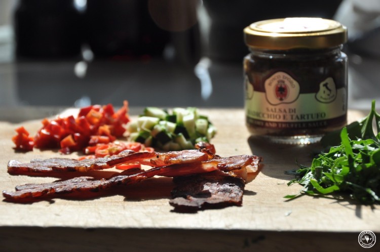 Der Speck ist ganz kross und wird in Streifen geschnitten. Mit gehobelten Parmesanspänen, Basilikum garnieren und als Finish mit ein paar Tropfen bestem natives Olivenöl beträufeln.