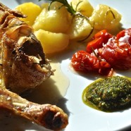 Mit zerdrücktem Knoblauch, Kartoffeln und dem Rucola-Mandel-Pesto anrichten.
