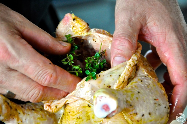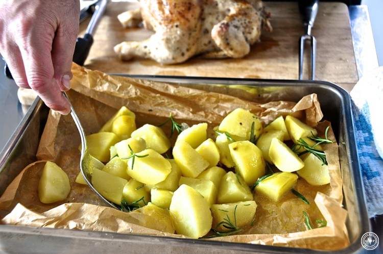 Danach den Vogel aus dem Bräter heben. Die Kartoffeln mit dem Rosmarin im ausgetretenen Hühnchenfett im Bräter schwenken und dann zusammen mit dem Hühnchen – dieses Mal mit der Brustseite nach oben – für weitere 20 min. ins Rohr schieben.