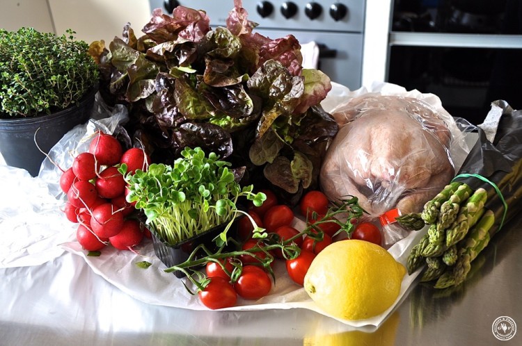 Hier sind unsere Schätze des heutigen Einkaufs. Eine herrliche Vielzahl von lokalem Gemüse, grünem Spargel aus Italien, Bio-Bananen aus Bananien, Daikon-Kresse von der Reichenau und Freiland-Hühnchen aus Oberschwaben.