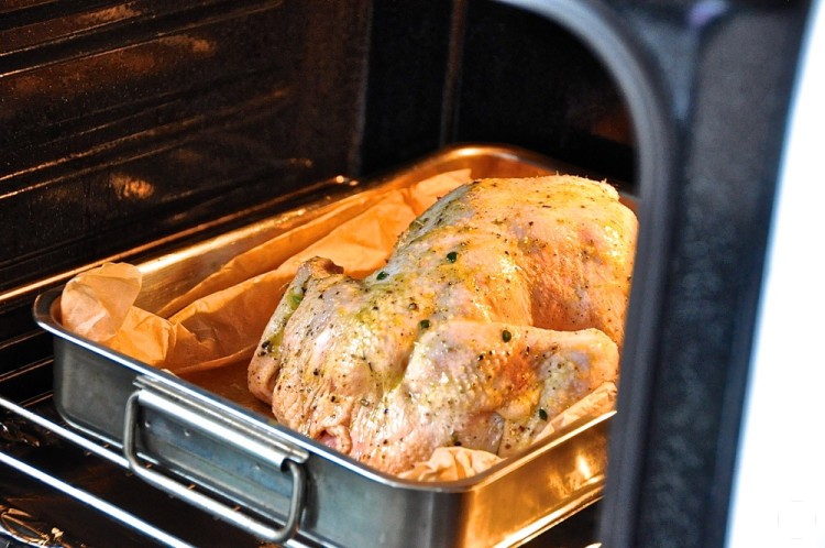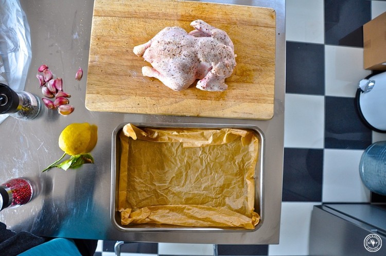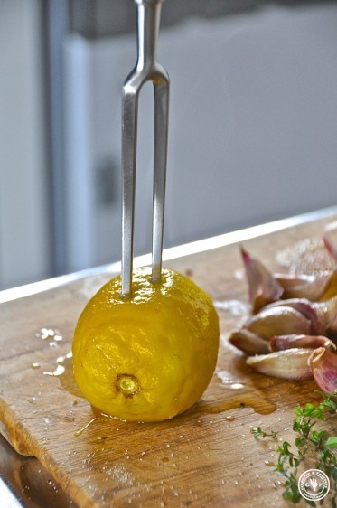 Der Bräter mit einem zerknüllten Backpapier auslegen (dann hält es besser) und die Zitrone mit einer Fleischgabel 5mal einstechen (da läuft der heiße Saft bereits in Strömen).