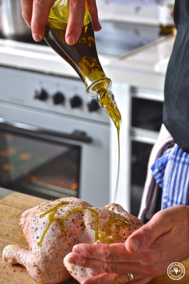 Das Hähnchen von innen und aussen kräftig salzen und pfeffern,