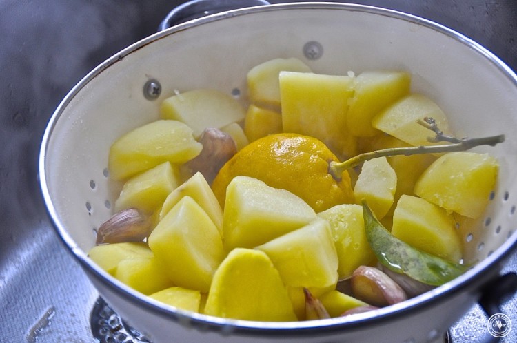 Zusammen mit den Zehen einer ganzen Knoblauchknolle und einer Zitrone in Salzwasser