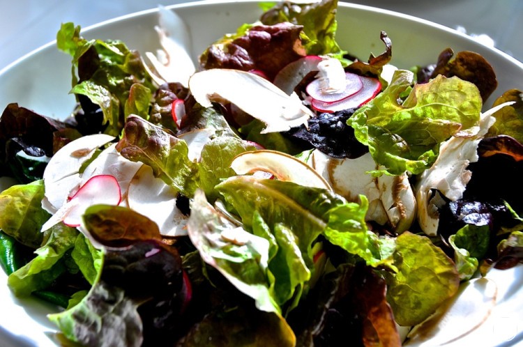 Den Salat waschen, 2 Champignons und 5 Radieschen in feine Scheiben hobeln und mit rotem Eichblattsalat anrichten.