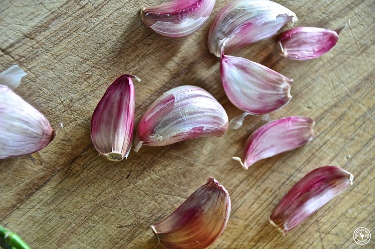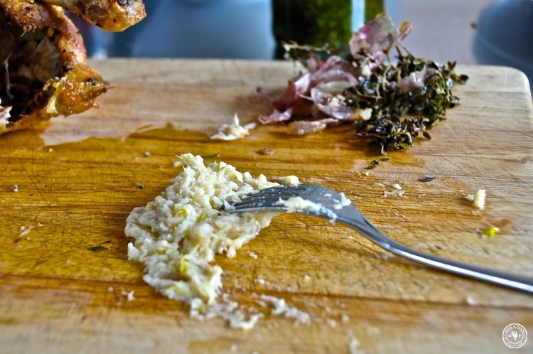 Den Knoblauch aus der Schale drücken und mit einer Gabel pürieren.