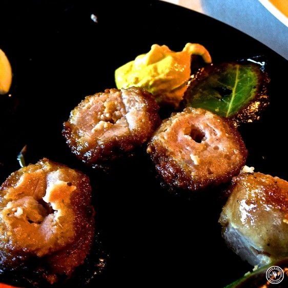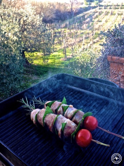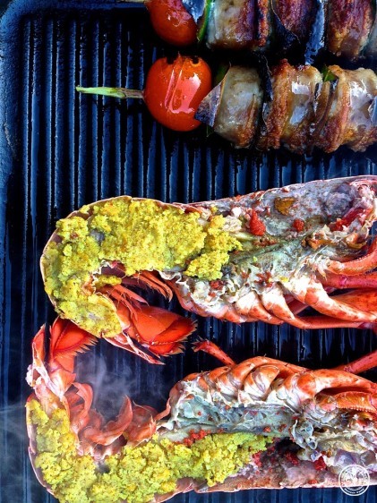 säubern (Hirn etc. entfernen) und mit Orangenbutter füllen (siehe oben 250g Butter, 150 ml frischer Orangensaft, 1 TL Curry, Maldon Salzflocken). Die habe ich wie gesagt bereits einen Tag vorher zubereitet. Zuerst grillen wir in einer Grillpfanne die Salsiccia-Spieße.