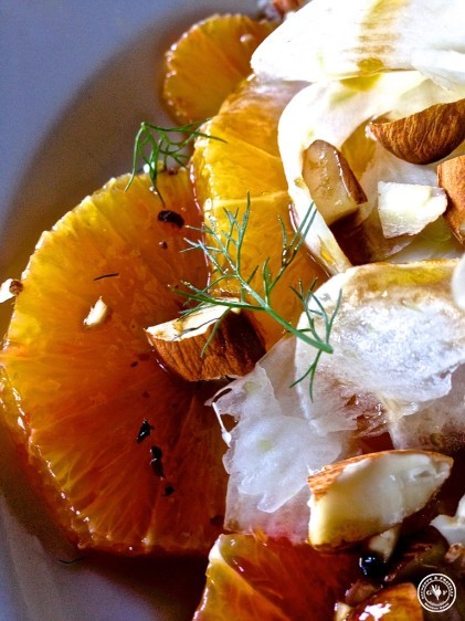 Für den Salat die Orangen häuten und in Scheiben schneiden, den Fenchel ganz fein hobeln, die Mandeln hacken und mit einem Dressing aus 2 EL Olivenöl, 1 EL Balsamico, Salz/Pfeffer nach Gusto in ein Einmachglas geben und schütteln. Das Dressing mit einem Esslöffel über den Salat träufeln und fertig.