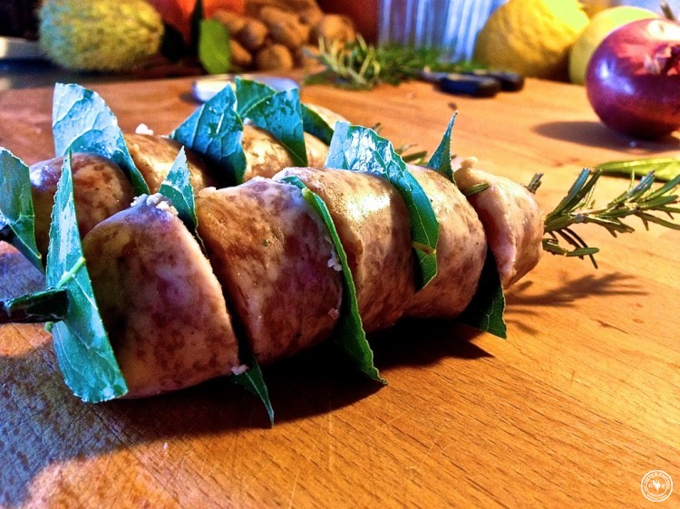 Die Salsiccia immer abwechselnd mit einem halben Lorbeerblatt auf einen Rosmarinzweig aufspießen.