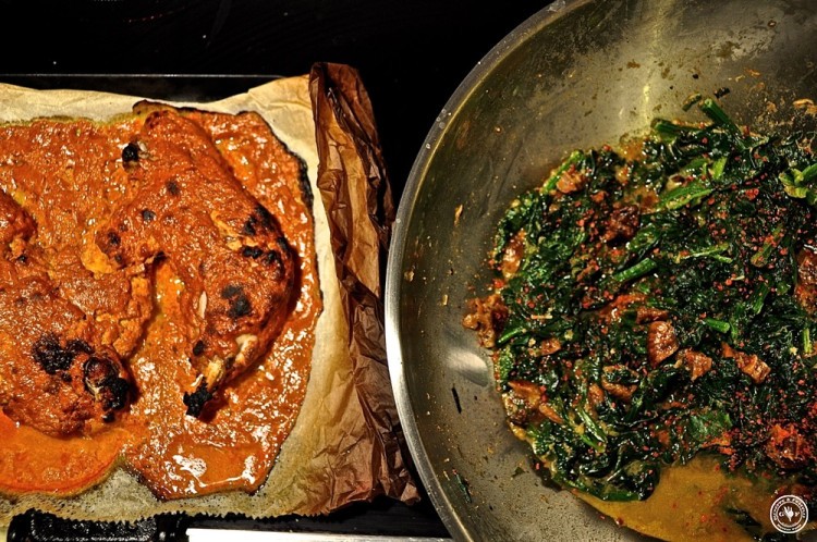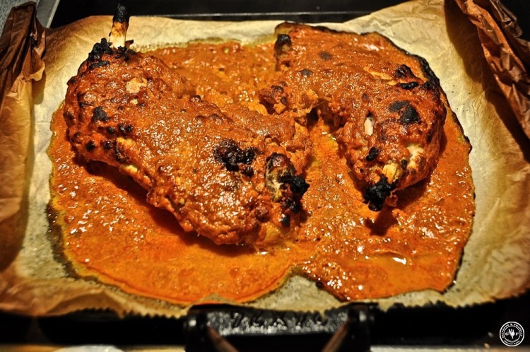 Am nächsten Tag den Herd auf die höchste Stufe schalten, die er bei Umluft hergibt. Ein echter Tandoori-Ofen bringt bis zu 400 Grad. Da geht natürlich alles super schnell. Mit einem solchen benötigt das Chicken nur wenige Minuten. Wir brauchen länger.