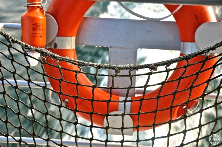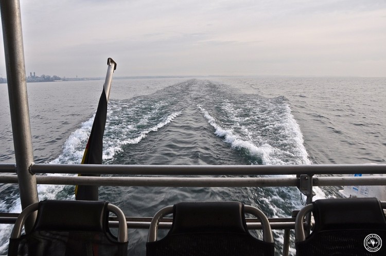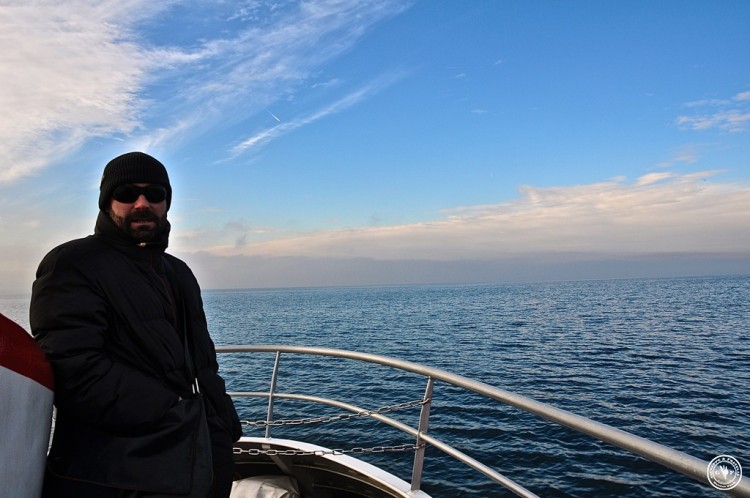 Die Tür zum Deck vorne ist verschlossen, aber auf Nachfrage dürfen wir raus, dort ist es nahezu arktisch schön. Zumindest die ersten 10 Minuten. Von Giuseppe bleibt nur ein wenig Nase und Wange übrig, der Rest ist vermummt oder zugewachsen. Der Eiswind drückt durch die dickste Daune und wir verziehen uns nach einiger Zeit nach hinten, wo es geschützter ist. Immerhin dauert die Überfahrt fast eine Stunde.
