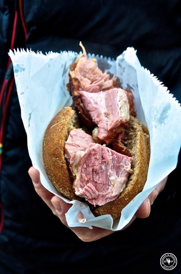 Es dauert nicht lang, dann heisst unser Thema mal wieder: Hunger! Und da drüben wird eine Sau am Spieß gedreht & gebraten. Der Duft ist unglaublich und das Saubrötchen mit dem Sau-erkraut auch! Unser Standnachbar will seines „gerne mit Schwarte aber dafür ohne Kraut“. Unnützes Vitaminzeugs im Winter brauche doch keiner, meint er.